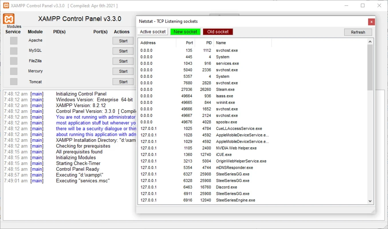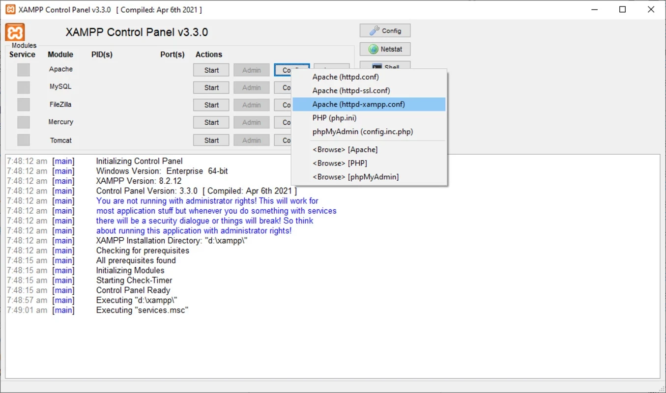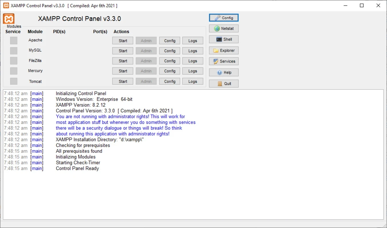Tras la instalación, diríjase al Panel de Control y haga clic en el botón «Iniciar». Se le solicitará que inicie Apache y MySQL en el Panel de Control. Puede acceder al panel de control a través de http://localhost con un navegador web como Google Chrome . Seleccione el directorio htdocs de la carpeta de instalación para guardar sus archivos web y gestione su base de datos accediendo a phpMyAdmin mediante http://localhost/phpmyadmin. Haga clic en la opción «Detener» para detener los servicios desde el Panel de Control. El Panel de Control contiene los siguientes componentes importantes: